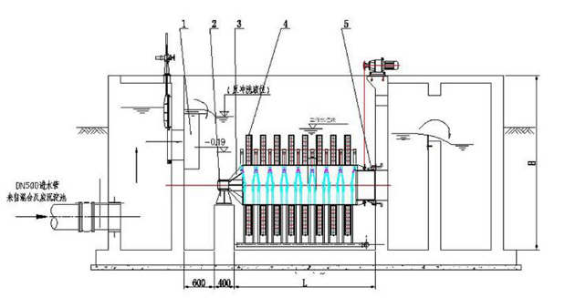(3)排泥:纖維轉(zhuǎn)盤濾池|纖維轉(zhuǎn)盤過濾器轉(zhuǎn)盤下設(shè)有斗型池底,有利于池底污泥收集。池底污泥沉積減少了濾布上的污泥量,可延長(zhǎng)過濾時(shí)間,減少反沖洗水量。經(jīng)過一設(shè)定的時(shí)間段,控制盤啟動(dòng)排泥泵,通過池底穿孔排泥管、閥、泵將污泥排至污泥系統(tǒng)。其中,排泥間隔時(shí)間及排泥歷時(shí)可以調(diào)整。