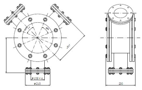 分匯器是一個三通閥,通過導(dǎo)向板的切換可使膠球進(jìn)入需要清洗的一側(cè)凝汽器中工作。一般一臺機組需兩臺分匯器,其進(jìn)口通徑為DN100,分配口為DN89,膠球投用時可通過窺視窗觀察運行情況。